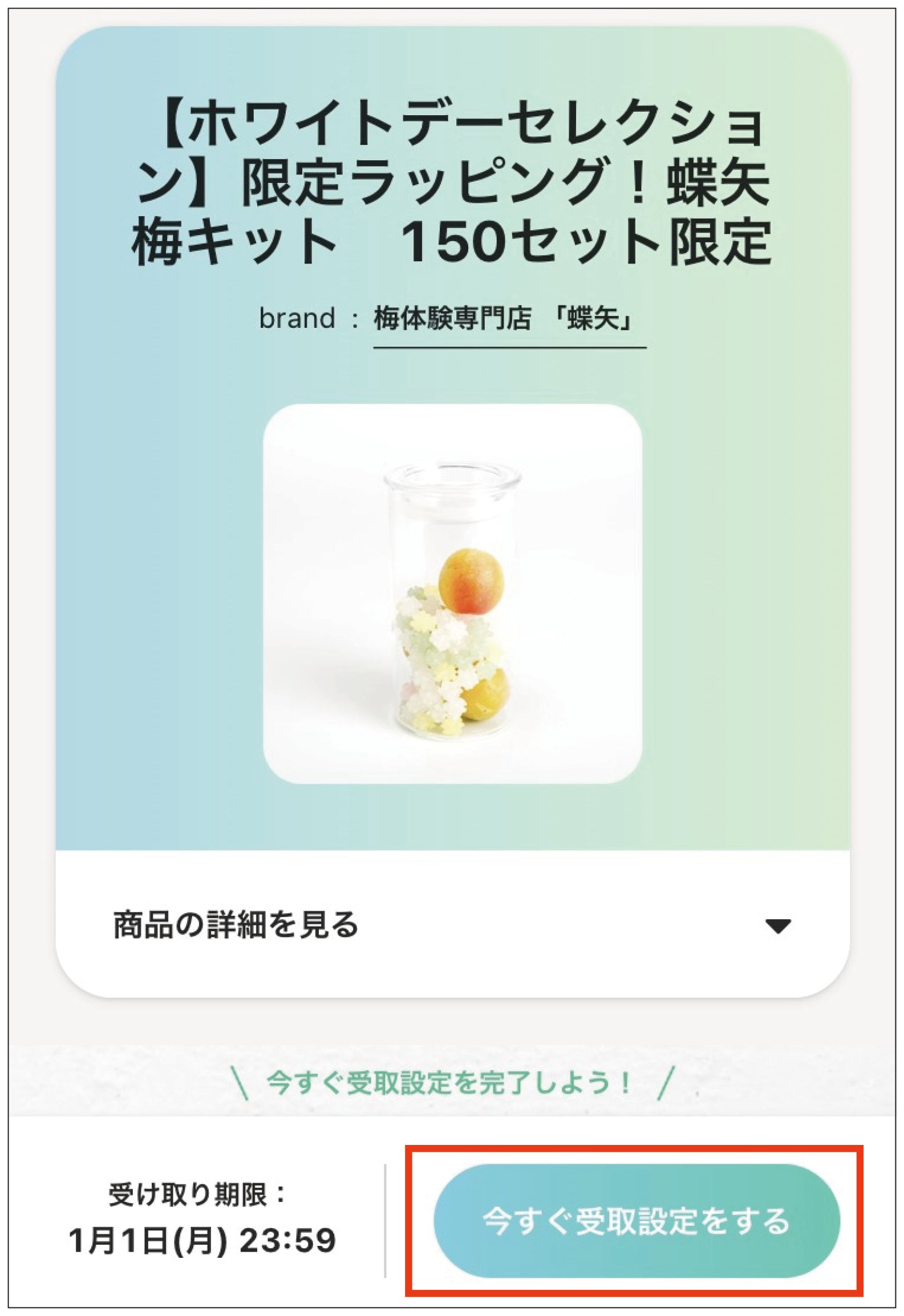 URLをタップすると受け取り画面が表示されます。「今すぐ受取設定をする」をタップしてお届け先情報の入力に進みます。