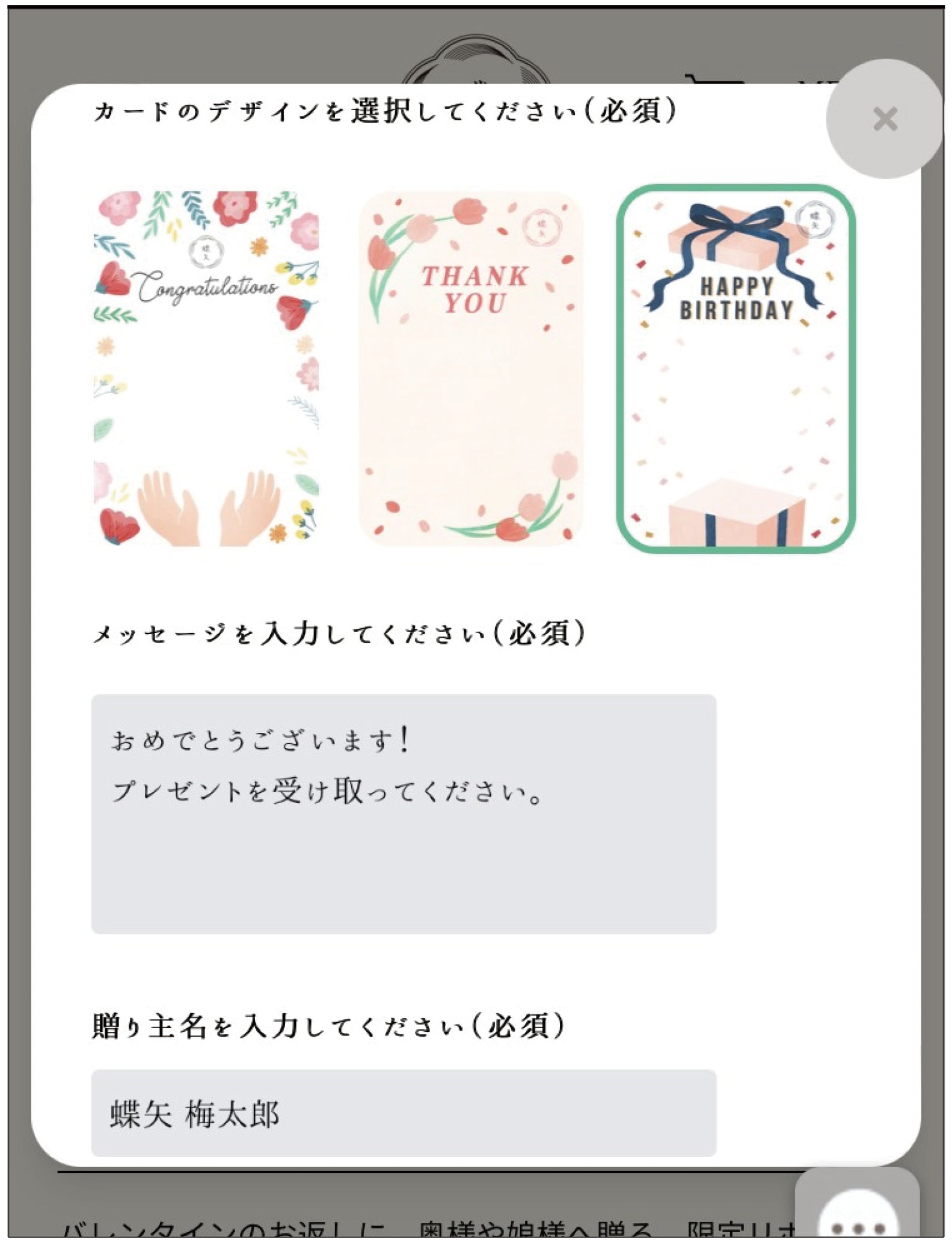 メッセージカードのデザインをお選びいただき、メッセージとあなたのお名前を入力します。