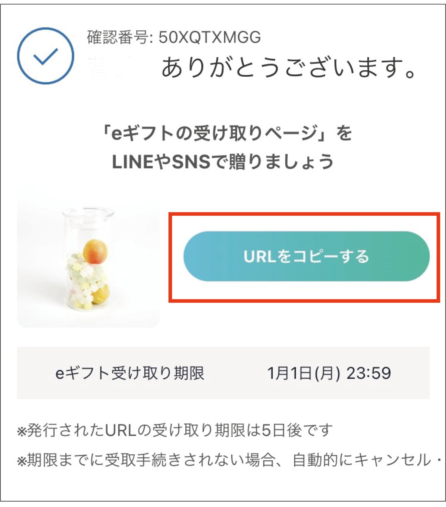 購入が完了すると、購入完了画面にeギフトの受け取りURLが発行されます。
